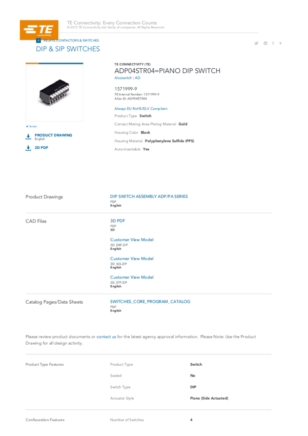 Switch DIP OFF ON SPST 4 Piano 0.1A 24VDC Gull Wing 2.54mm SMD T/R