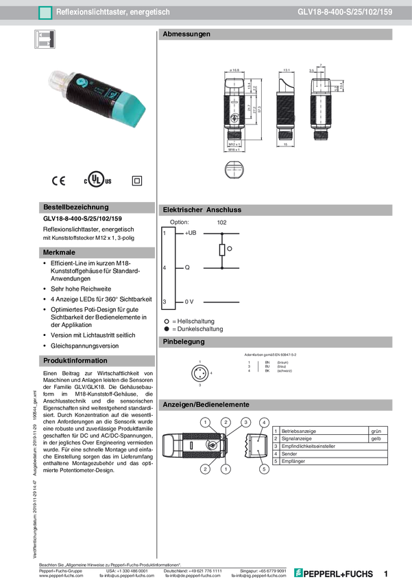 Czujnik dyfuzyjny Pepperl+Fuchs GLV18-8-400-S/25/102/159 190544 przełączanie światła 1 szt.