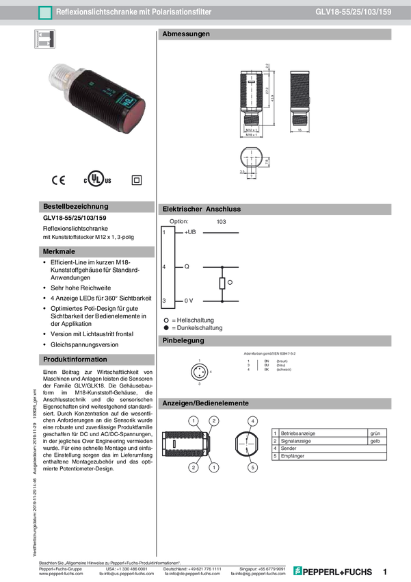 Fotokomórka odbiciowa Pepperl+Fuchs GLV18-55/25/103/159 193026 Polaryzator, przełączanie światła 1 szt.