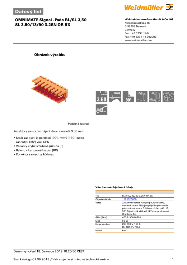 Weidmüller Obudowa złącza pin męskiego na PCB BL/SL Ilość pinów 13 Wymiary siatki: 3.50 mm 1597320000 50 szt.