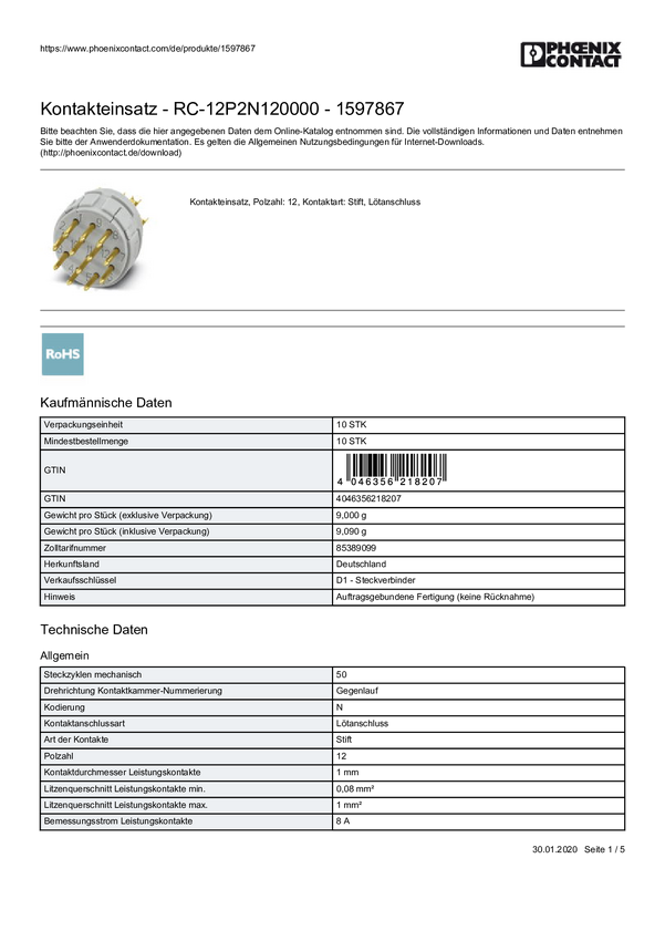 Złącze 1597867 RC-12P2N120000 Phoenix Contact Zawartość: 10 szt.