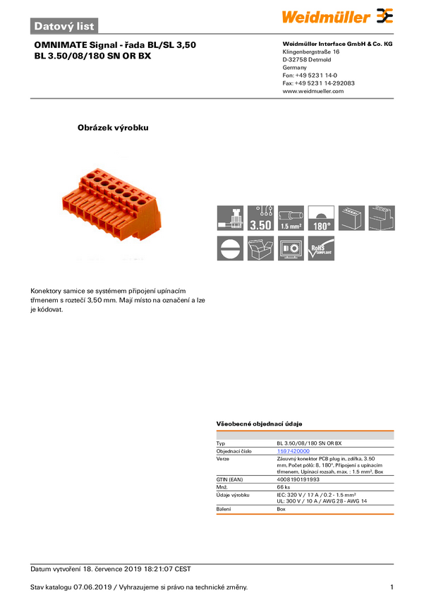 Weidmüller 1597420000 Obudowa złącza pin żeńskiego na kabel BL 3.50/08/180 SN OR BX, wire-to-board, piny: 8, 10 A, 66 sz