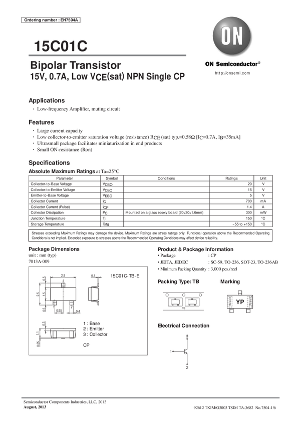 Bipolar Transistor 15V 700mA VCE(sat);300mV max. NPN Single CP