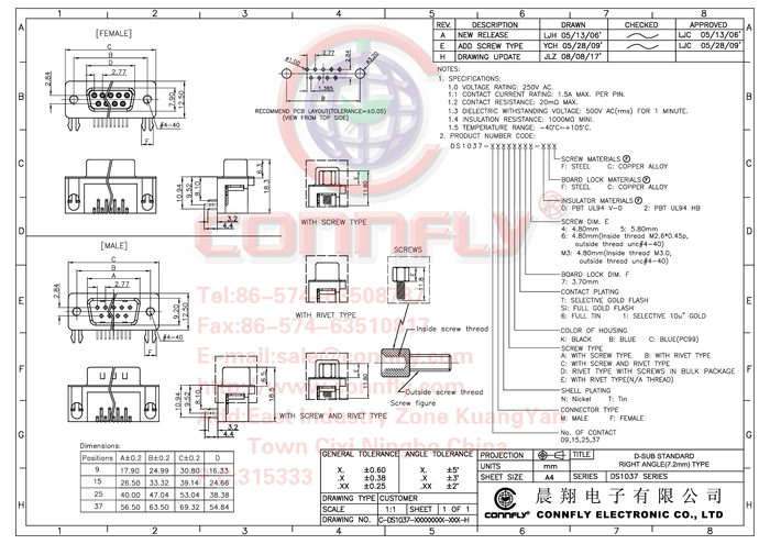 Connfly DS1037-15FNAKT74-0CC Listwa żeńska D-Sub DS1037-15FNAKT74-0CC, rzędy: 2, styki: 15, 1 szt.
