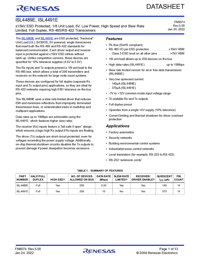 ±15kV ESD Protected, 1/8 Unit Load, 5V, Low Power, 15Mbps, Full Duplex, RS-485/RS-422 Transceivers