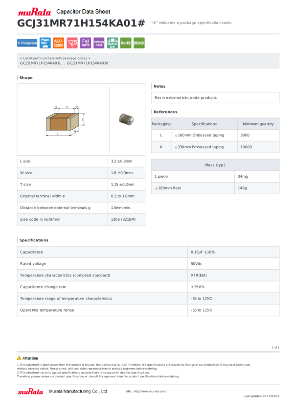 Cap Ceramic 0.15uF 50V X7R 10% SMD 1206 125°C Embossed T/R