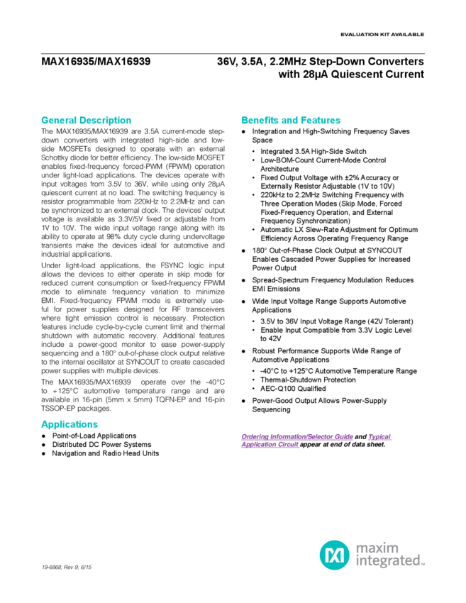 MAX16935 36V, 3.5A, 2.2MHz Step-Down Converter with 15uA Quiescent Current