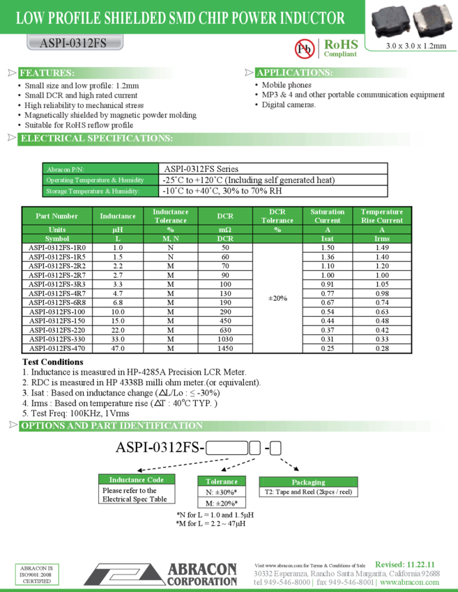 Ind Power Molded Wirewound 15uH 10% 100KHz Ferrite 1.8A Blister T/R