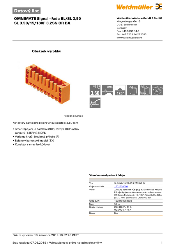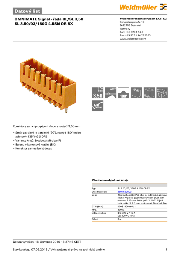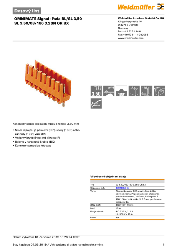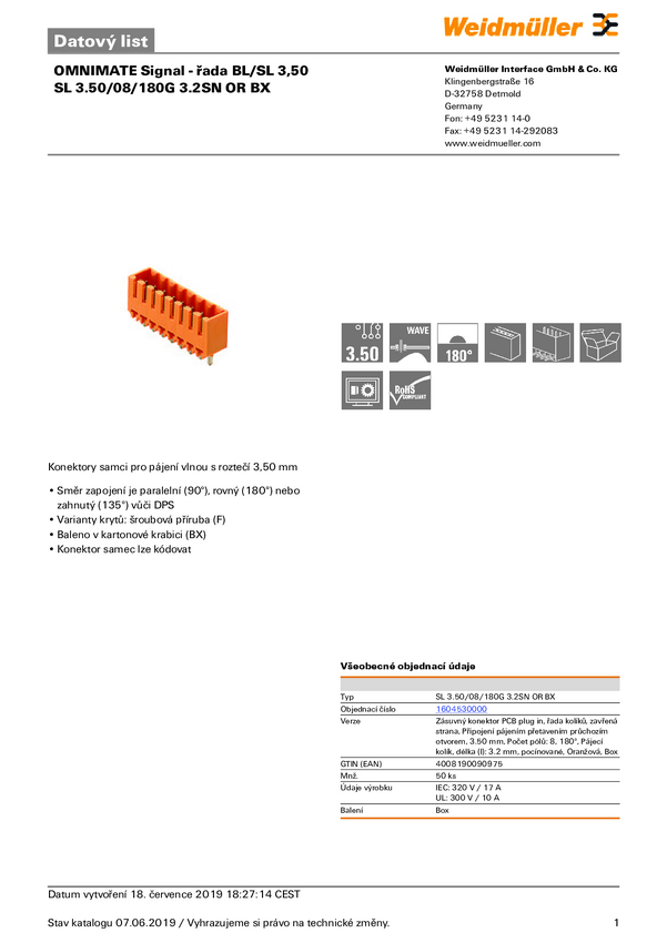 Weidmüller 1604530000 Obudowa złącza pin męskiego na PCB SL 3.50/08/180G 3.2SN OR BX, wire-to-board, piny: 8, 10 A, 50 s