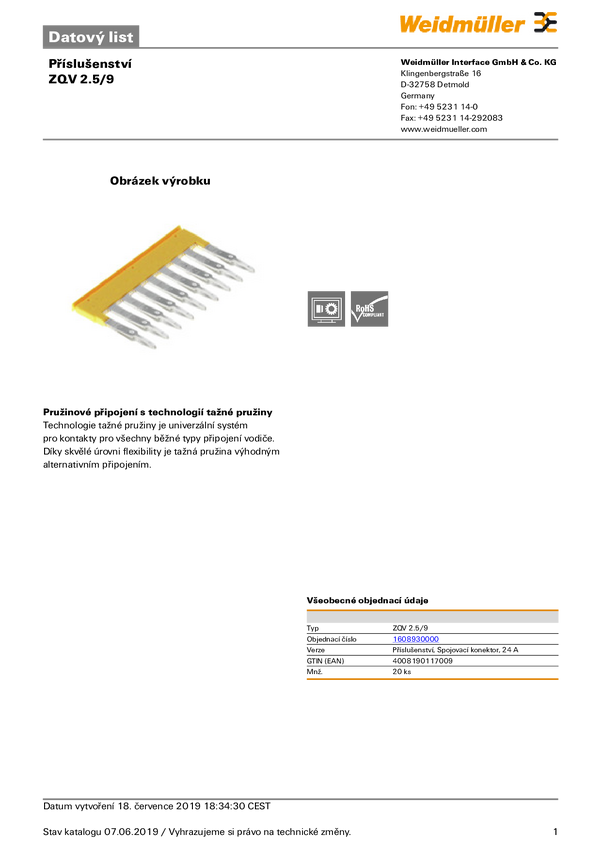 Łącznik krzyżowy Weidmüller ZQV 4/10 GE 1609030000-20, 20 szt.