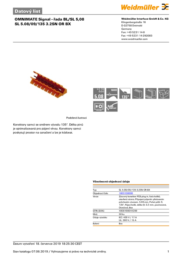 Weidmüller Obudowa złącza pin męskiego na PCB BL/SL 5.08 Ilość pinów 19 Wymiary siatki: 5.08 mm 1603230000 20 szt.