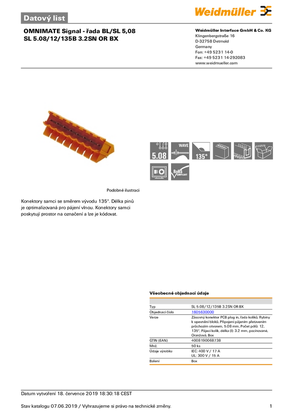 Weidmüller Obudowa złącza pin męskiego na PCB BL/SL 5.08 Ilość pinów 2 Wymiary siatki: 5.08 mm 1605530000 100 szt.