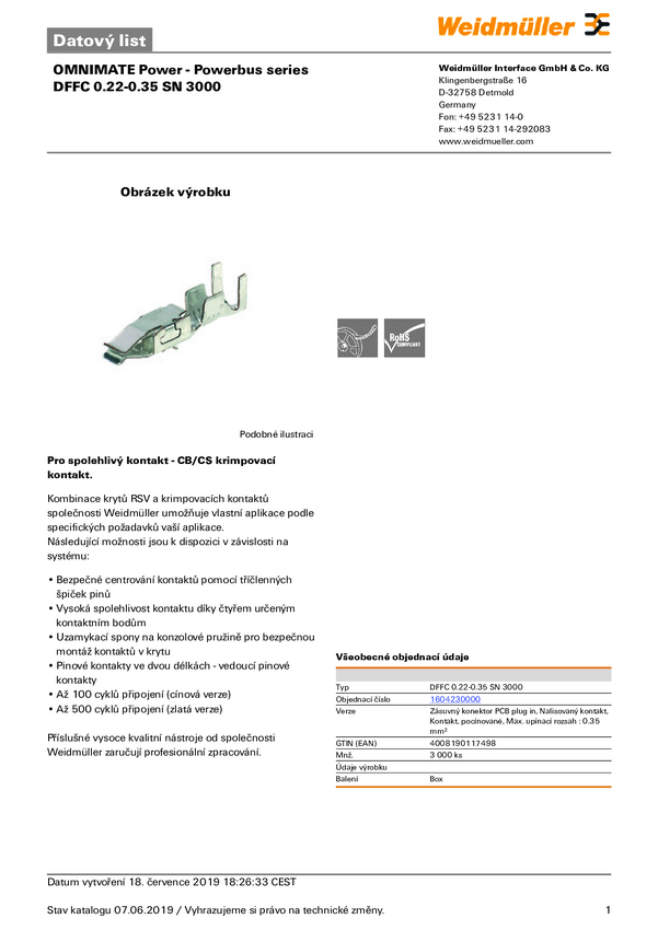 Weidmüller 1604230000 Styk zaciskany DFFC 0.22-0.35 SN 3000, wire-to-board, piny: 1, 3000 szt.