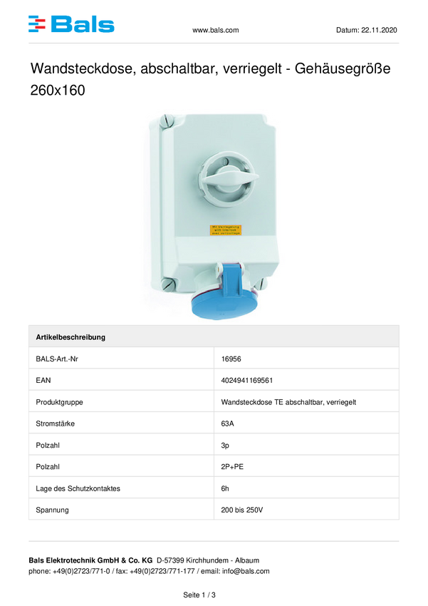 Gniazdo naścienne CEE Bals Elektrotechnik 16956 63.0 A 230 V