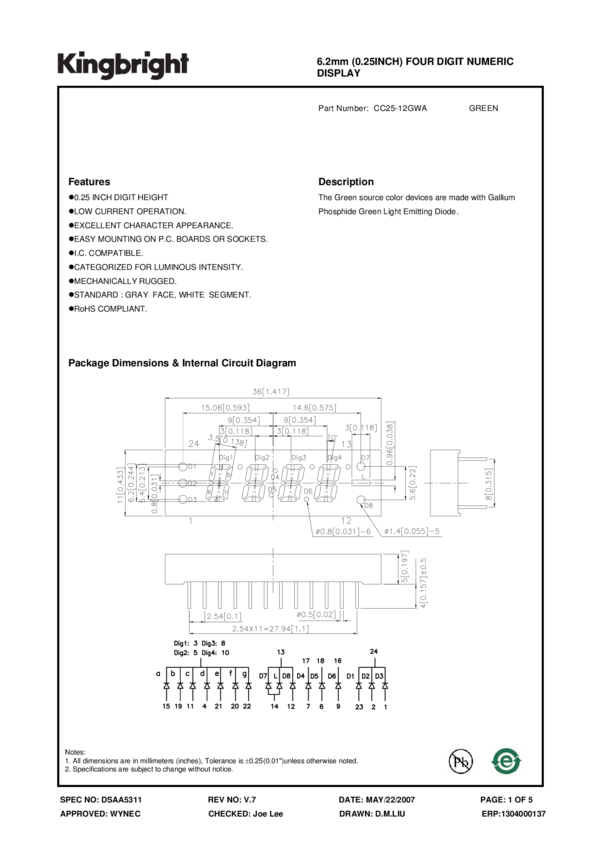 Displays Segmented Panel 4DIGIT 16LED Green CA 24-Pin DIP Tube