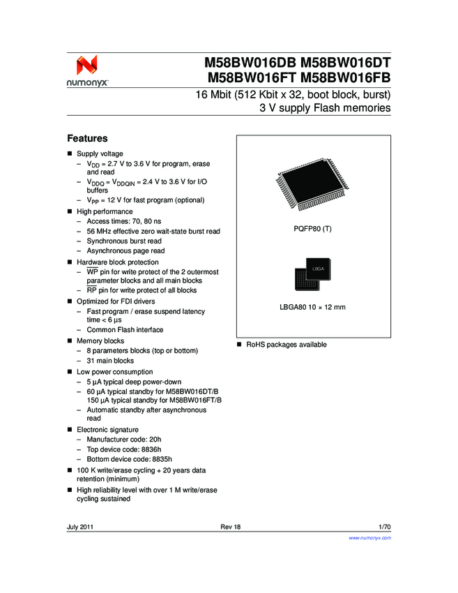NOR Flash Parallel/Serial 3V/3.3V 16Mbit 512K x 32bit 70ns 80-Pin PQFP T/R
