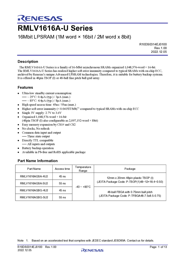 16Mbit LPSRAM (1M word × 16bit / 2M word x 8bit)
