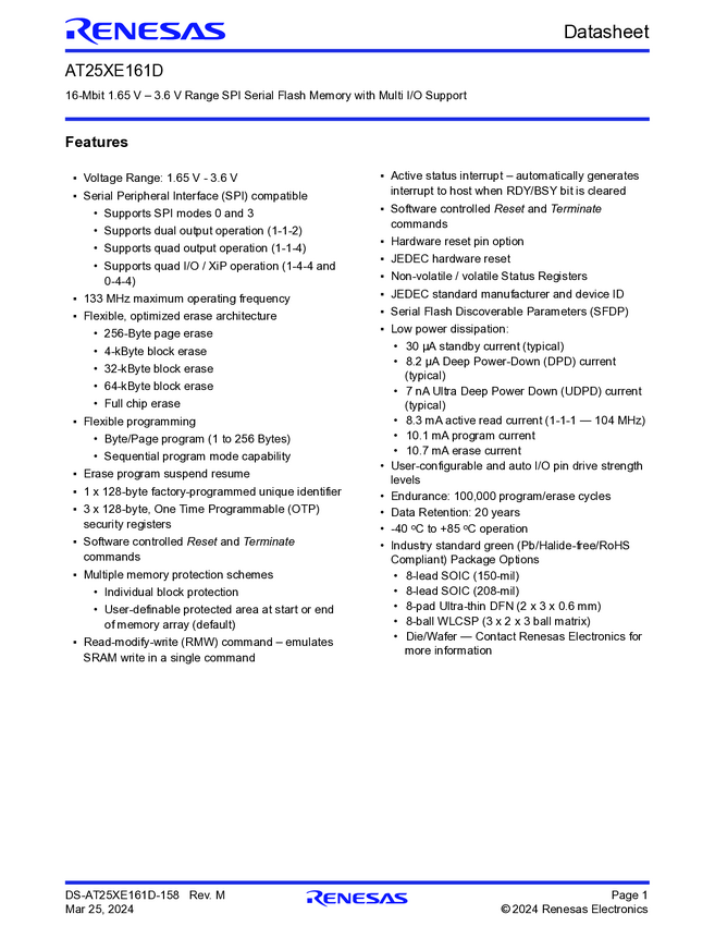 16Mbit, 2.3V to 3.6V Range SPI Serial Flash Memory