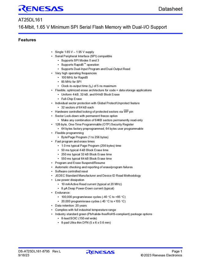 16Mbit, 1.65V Minimum SPI Serial Flash Memory with Dual I/O Support