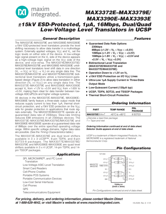 MAX3372E, MAX3373E, MAX3374E, MAX3375E, MAX3376E, MAX3377E, MAX3378E, MAX3379E, MAX3390E, MAX3391E, MAX3392E, MAX3393E ±15kV ESD-Protected, 1µA, 16Mbps, Dual/Quad Low-Voltage Level Translators in UCSP