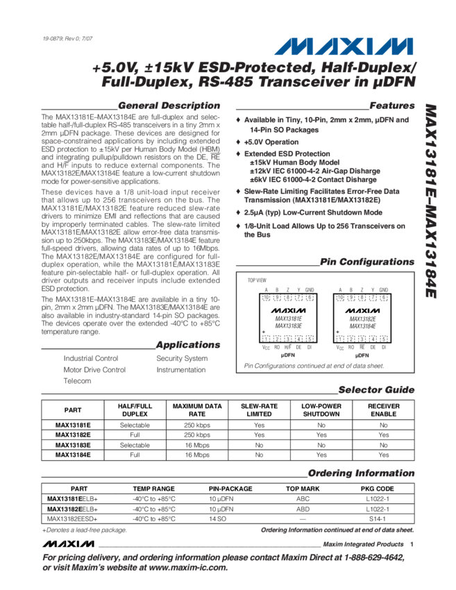 MAX13184E +5.0V, &#17715kV ESD-Protected, Full-Duplex, 16Mbps RS-485 Transceiver in &#181DFN