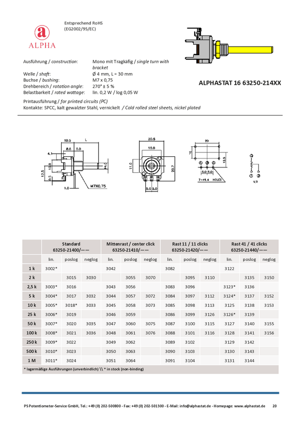 Potencjometr jednoobrotowy Potentiometer Service GhbH 16S W4B8L30 1KLIN