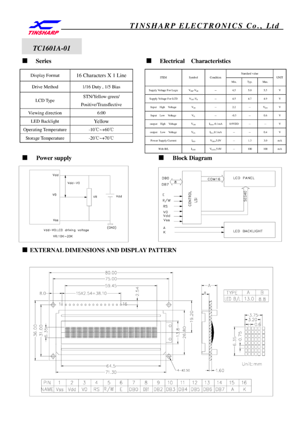 Matryca 16x1 znaków, z podświetleniem LED zółto-zielonym, STN Y/G, 6:00, -10/+60C, ekran , TinSharp