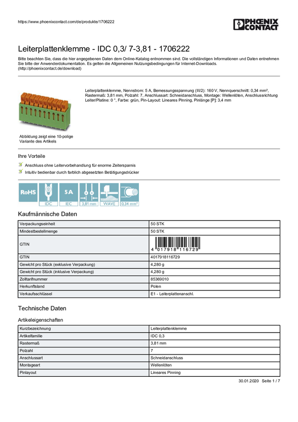 Phoenix Contact 1706222 Terminal PCB 0.34 mm² Ilość styków 7 zielony 50 szt.