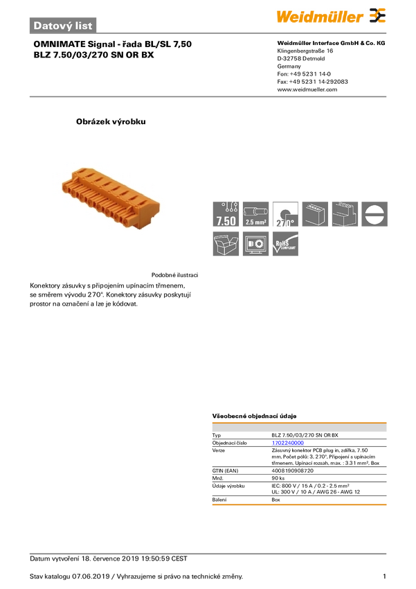 Weidmüller Obudowa złącza pin żeńskiego na kabel BL/SL Ilość pinów 3 Wymiary siatki: 7.50 mm 1702240000 90 szt.