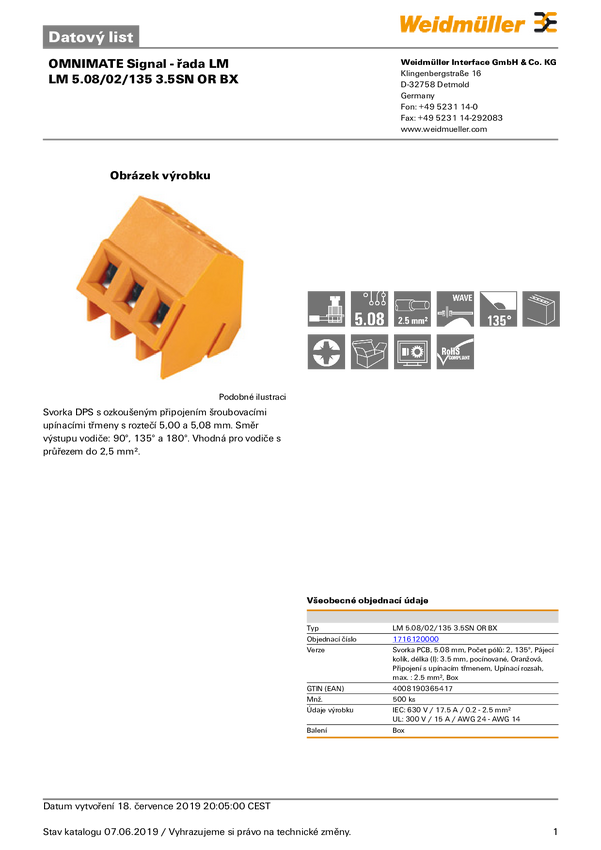 Weidmüller 1716120000 Zaciski śrubowe 2.5 mm² Ilość styków 2 pomarańczowy 500 szt.