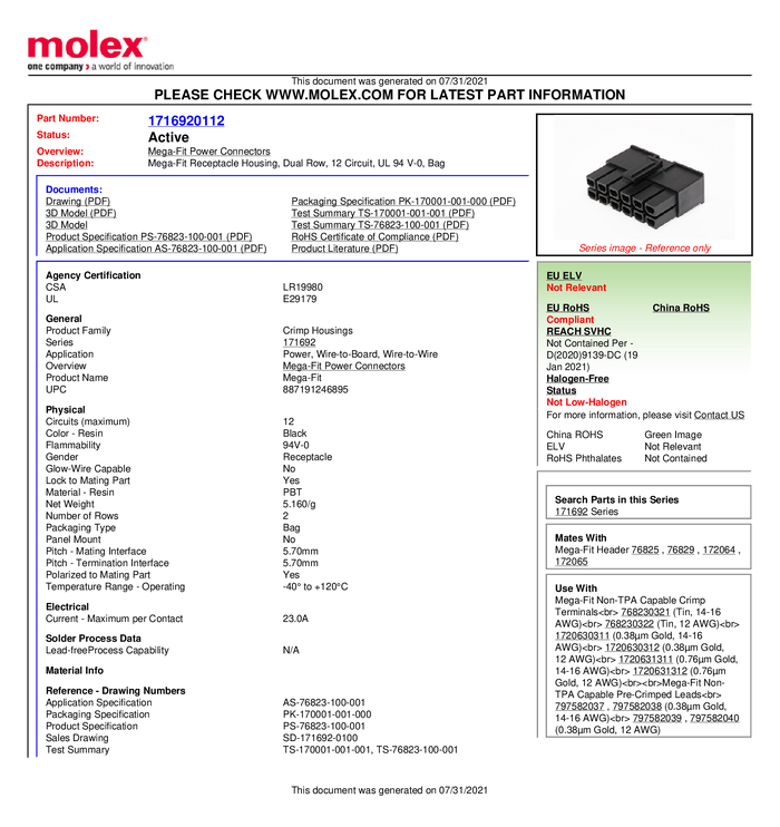 Molex Obudowa złącza pin żeńskiego na kabel Ilość pinów 12 Wymiary siatki: 5.7 mm 1716920112 1 szt. torba
