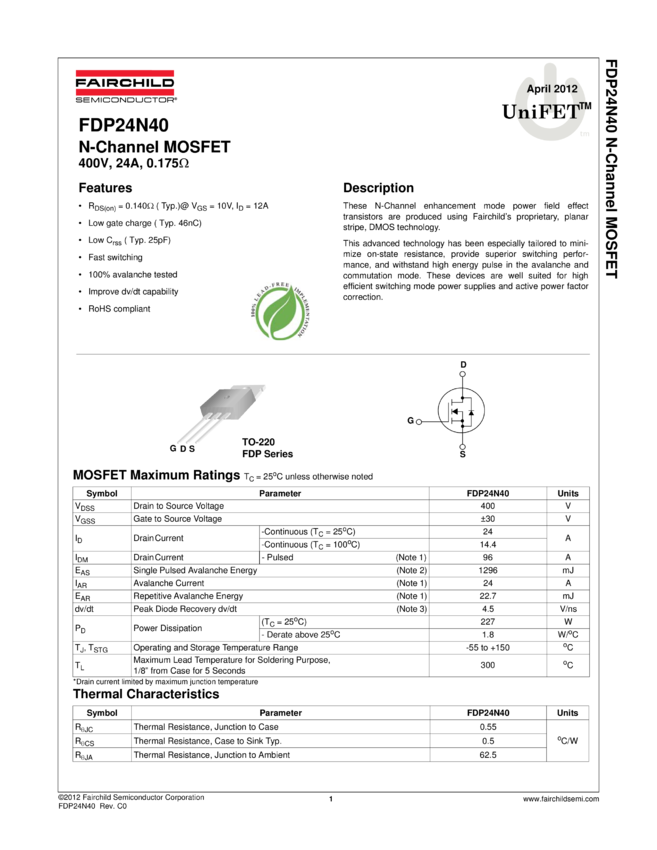N-Channel UniFET<sup>TM</sup> MOSFET 400V, 24A, 175mΩ