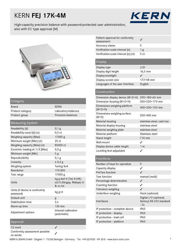 Kern FEJ 17K-4M Waga precyzyjna Zakres pomiaru maks. 17 kg Podziałka 0.1 g srebrny