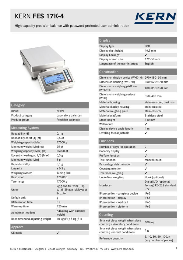 Waga precyzyjna Kern FES 17K-4, Zakres pomiaru maks.: 17 kg, Podziałka: 0.1 g