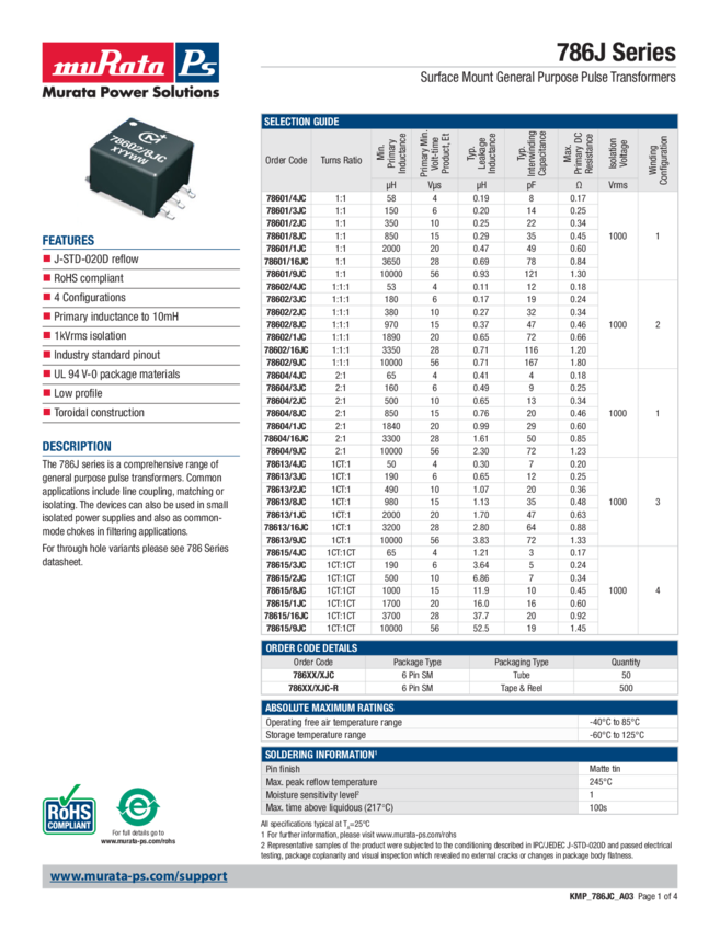 Pulse Transformer 1:1 1000Vrms 0.17Ohm Prim. DCR 8pF 4Vus Through Hole