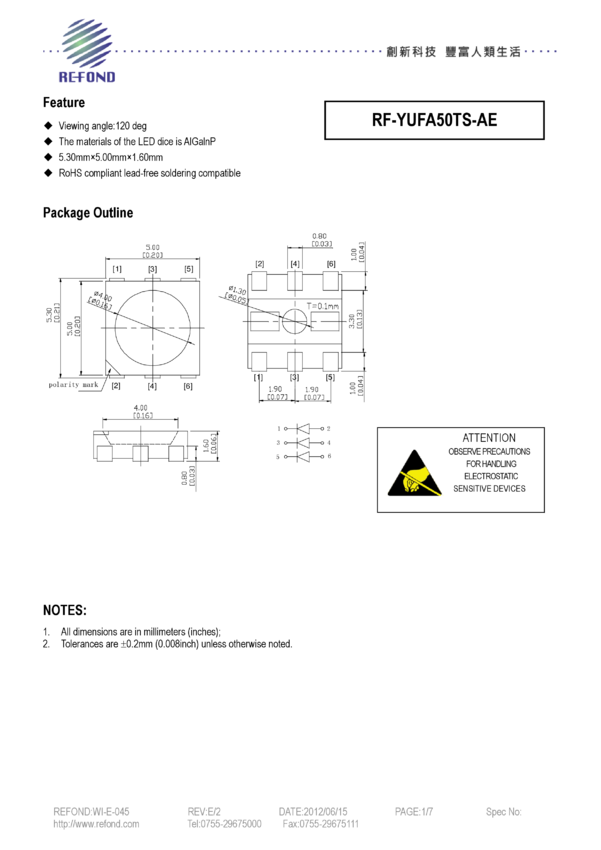 Dioda LED, 585-595nm, jasna 800 -1800mCd, 20mA/chip, water-clear, 120°, PLCC6, Refond