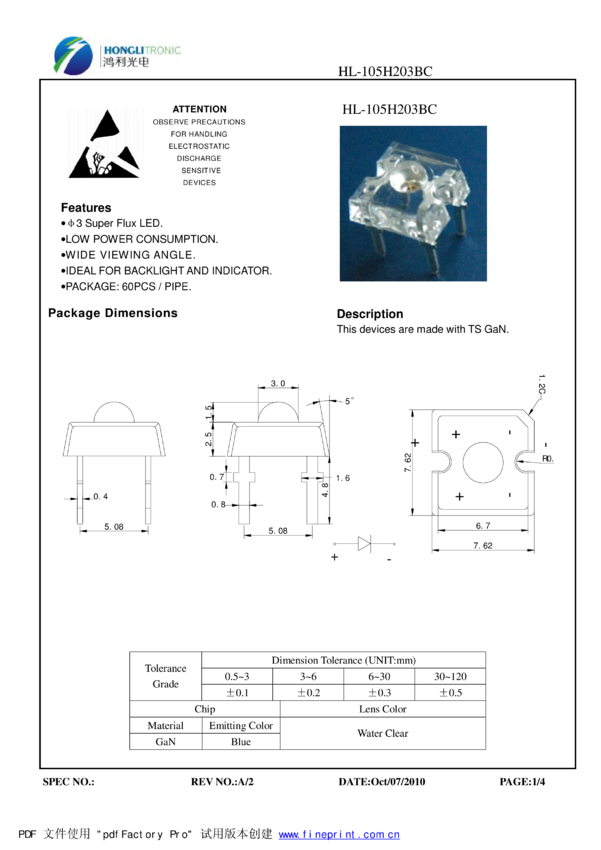 Dioda Super Flux, , 470nm, 1800mcd /20mA, kąt 80° Honglitronic