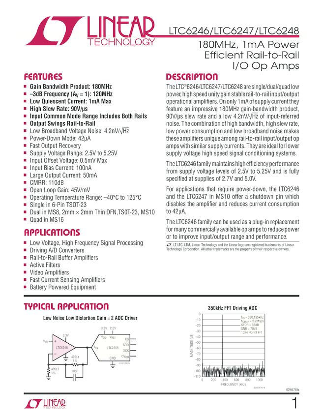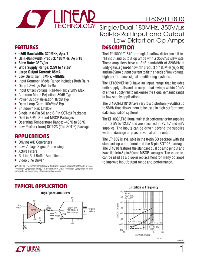 Single 180MHz, 350V/µs Rail-to-Rail Input and Output Low Distortion Op Amps
