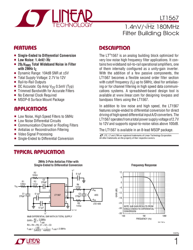 180MHz, Low-Noise Fully Differential SAR ADC Driver
