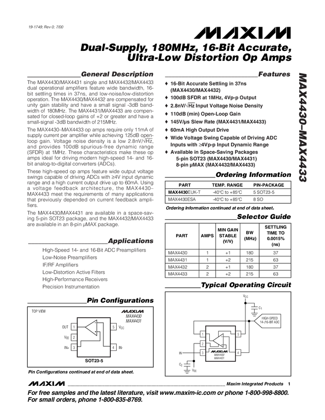 Dual-Supply, 180MHz, 16-Bit Accurate, Ultra-Low-Distortion Op Amps