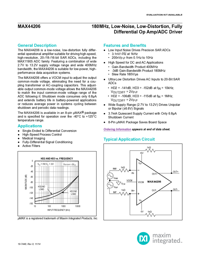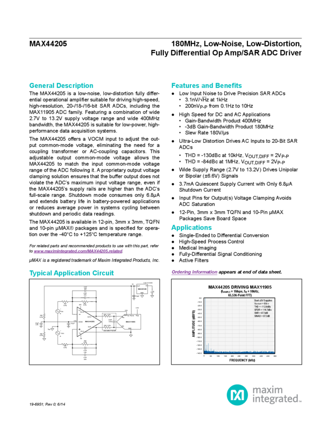 MAX44205 180MHz, Low-Noise Fully Differential Op Amp/SAR ADC Driver