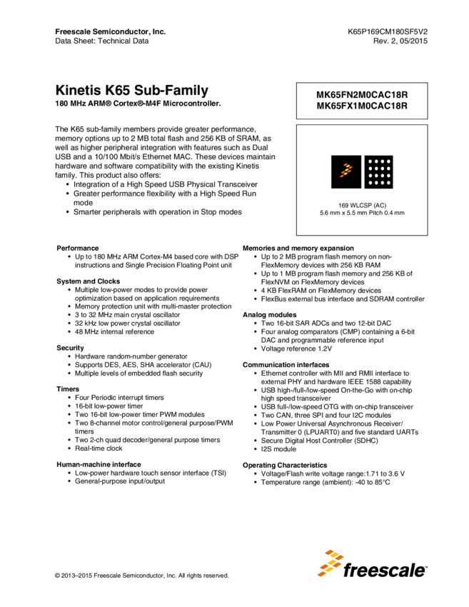 Kinetis K65: 180MHz Cortex-M4F up to 2MB Flash (169pin)