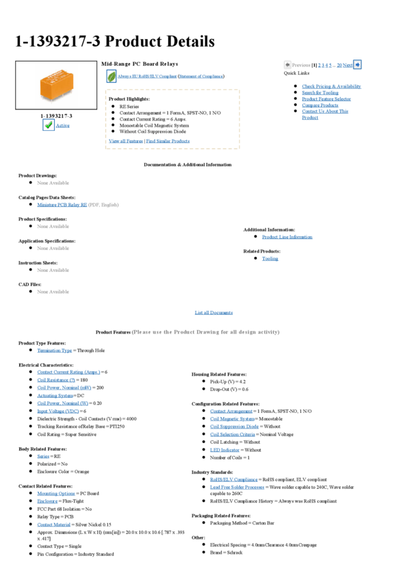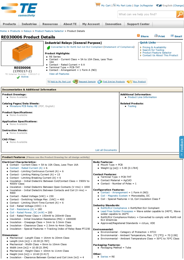 Electromechanical Relay SPDT 1.25A 6VDC 180Ohm Through Hole
