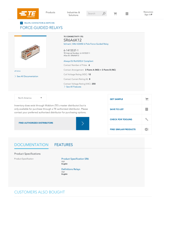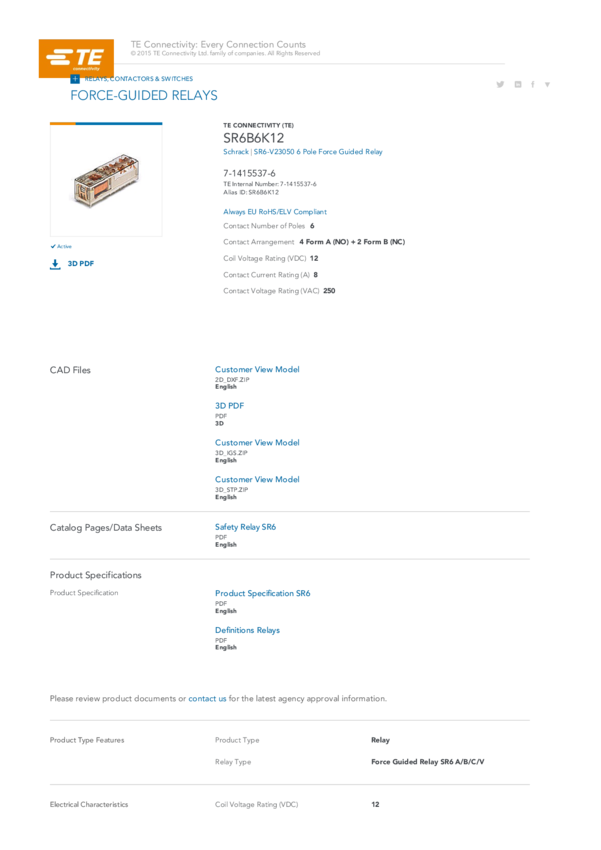 Electromechanical Relay 3PST-NO/3PST-NC 8A 12VDC 180Ohm Through Hole