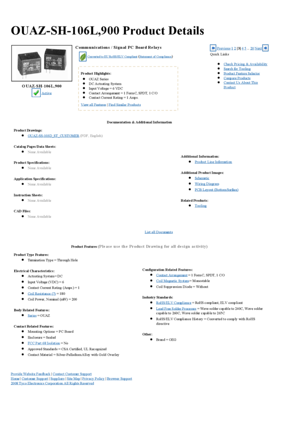 Electromechanical Relay SPDT 3A 6VDC 180Ohm Through Hole