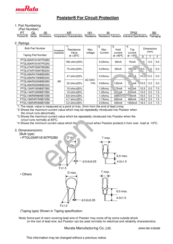 Thermistor PTC 180Ohm 20% 2-Pin Radial Bulk