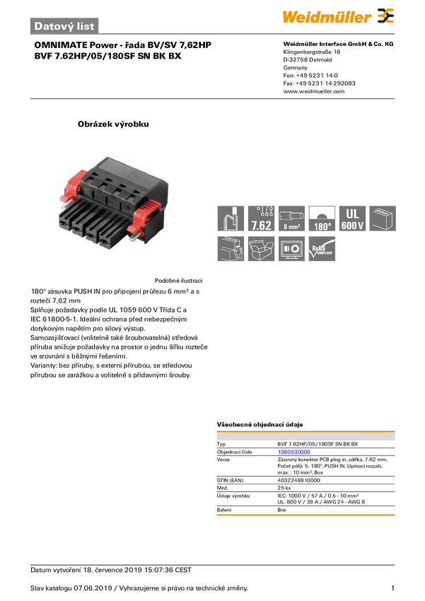 Weidmüller 1060540000 Obudowa złącza pin żeńskiego na kabel BVF 7.62HP/06/180SF SN BK BX, wire-to-board, piny: 6, 36 A,