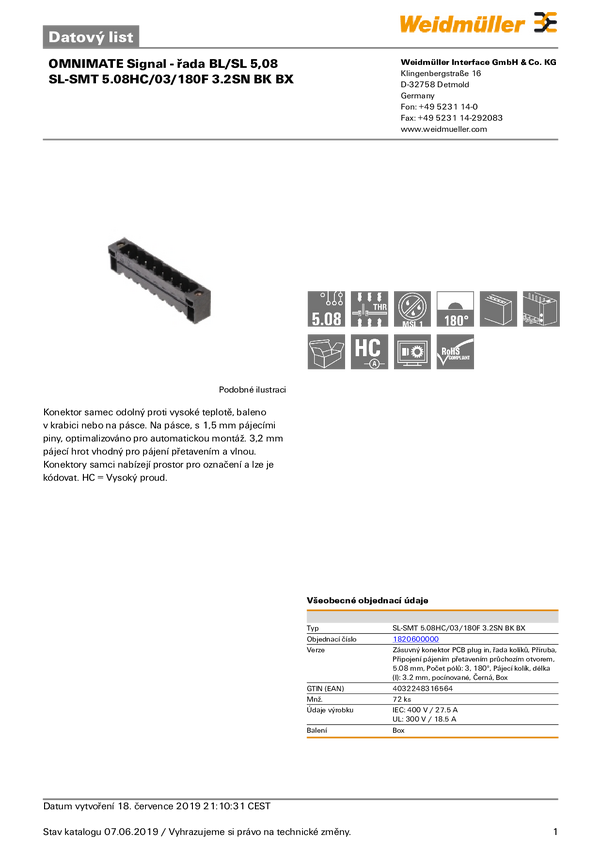 Weidmüller Obudowa złącza pin męskiego na PCB BL/SL 5.08 Ilość pinów 3 Wymiary siatki: 5.08 mm 1820600000 100 szt.