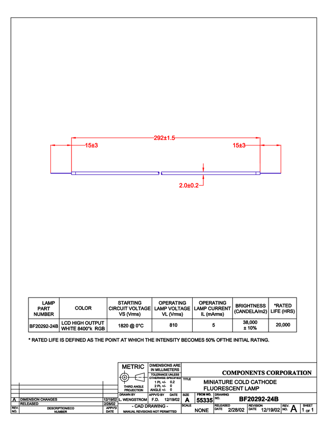 Lampa CCFL średnica 2,0 mm ; długość 292mm; start.volt. 1820V; zasilanie lampy 810 V; prąd 5 mA; jasność 38.000 Cd./m2 Temperatura barwowa 5100 K - 5716 K