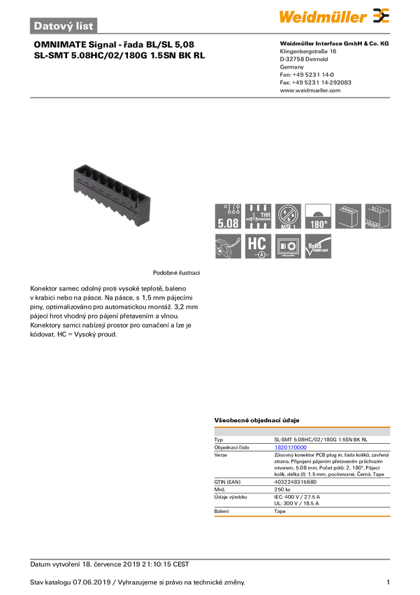 Weidmüller Obudowa złącza pin męskiego na PCB BL/SL Ilość pinów 2 Wymiary siatki: 5.08 mm 1820170000 250 szt.